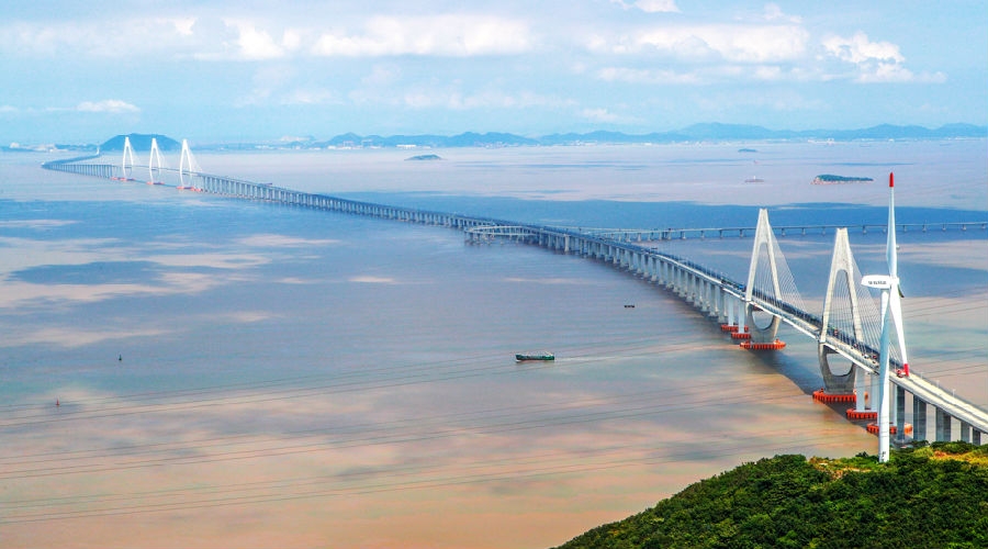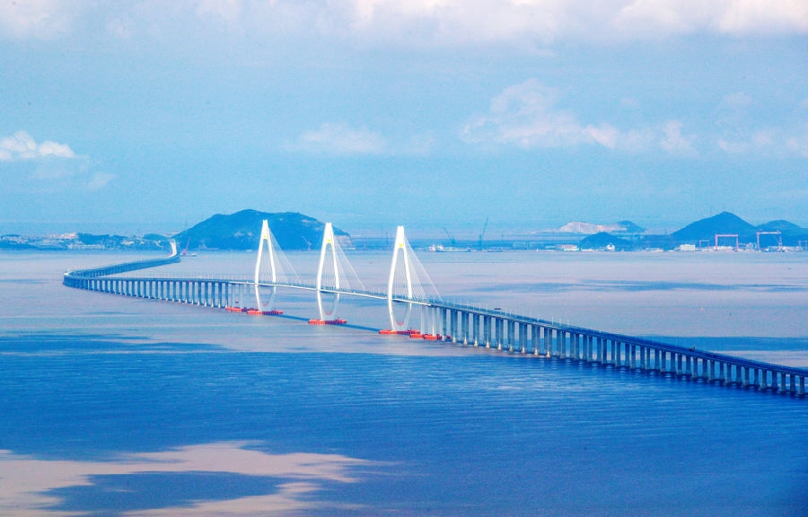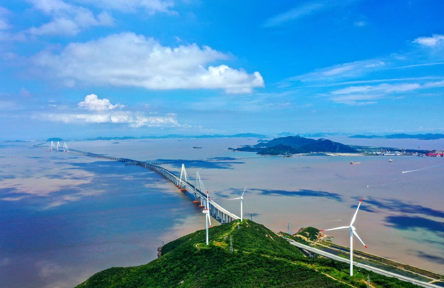 9月10日下午,在舟山市灰鳖洋海面,由浙江省交通集团牵头投资建设的宁波舟山港主通道项目舟岱大桥似蛟龙出水遨游东海,蔚为壮观。