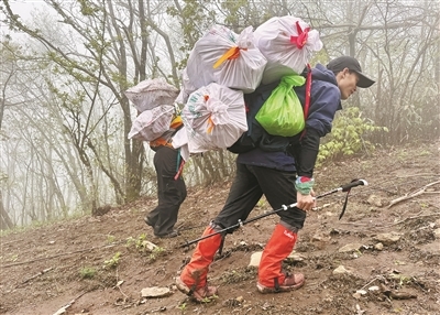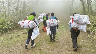 当天下午4点多,两队人员会合。有的肩挑,有的背扛,有的拖着,有的抱着,共从山里带走58袋垃圾。
